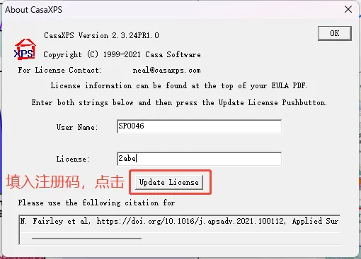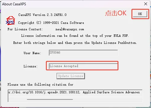 填入注册码后,点击update License,显示License Accepted后点击OK(注意 User Name 中的空格),即可使用。