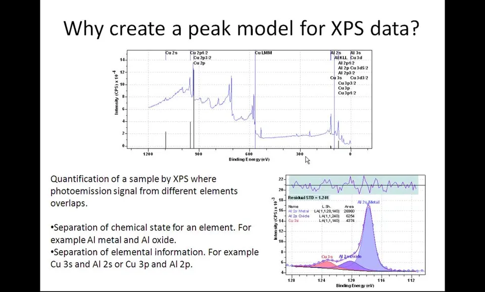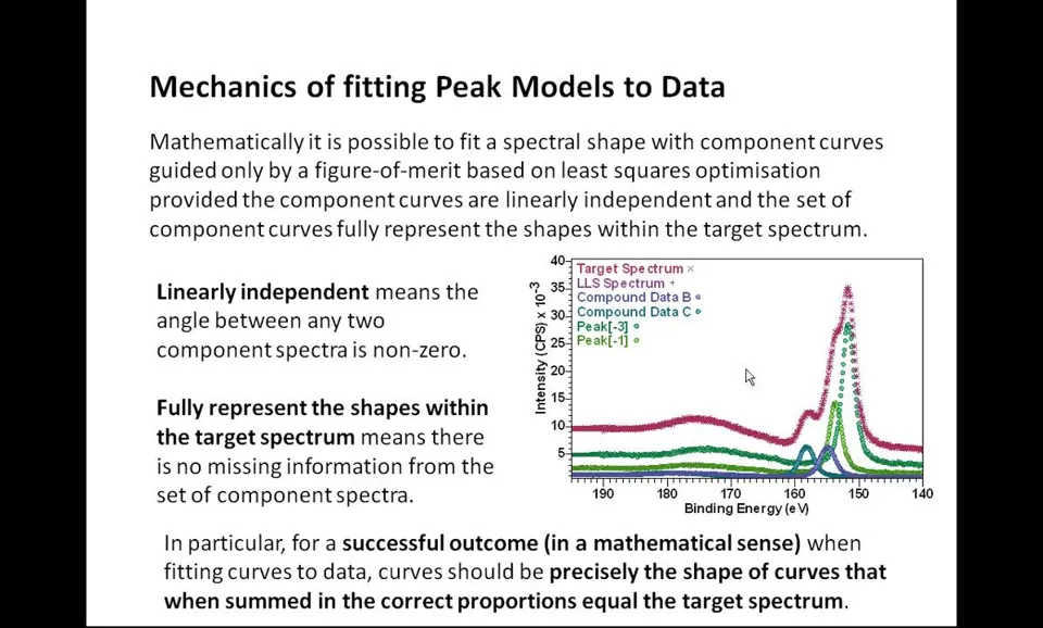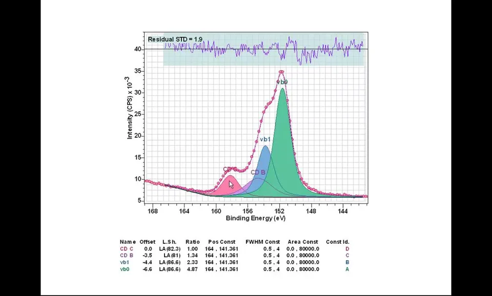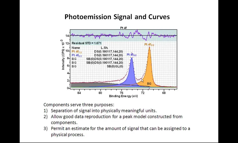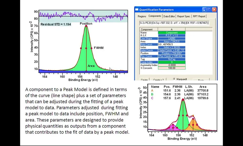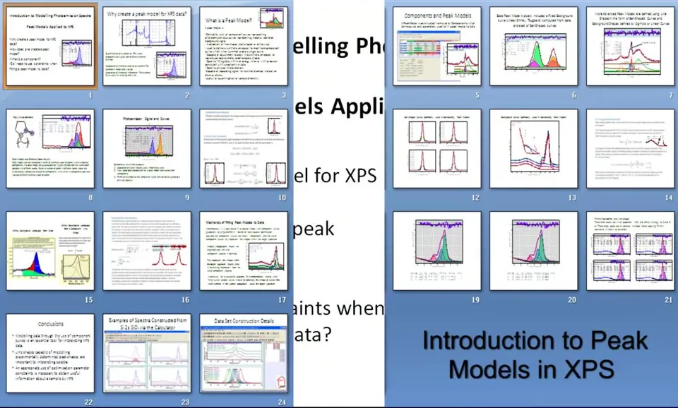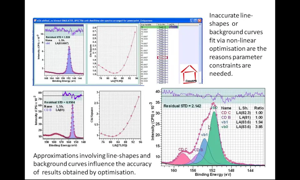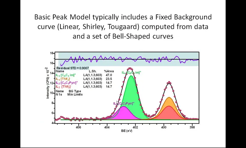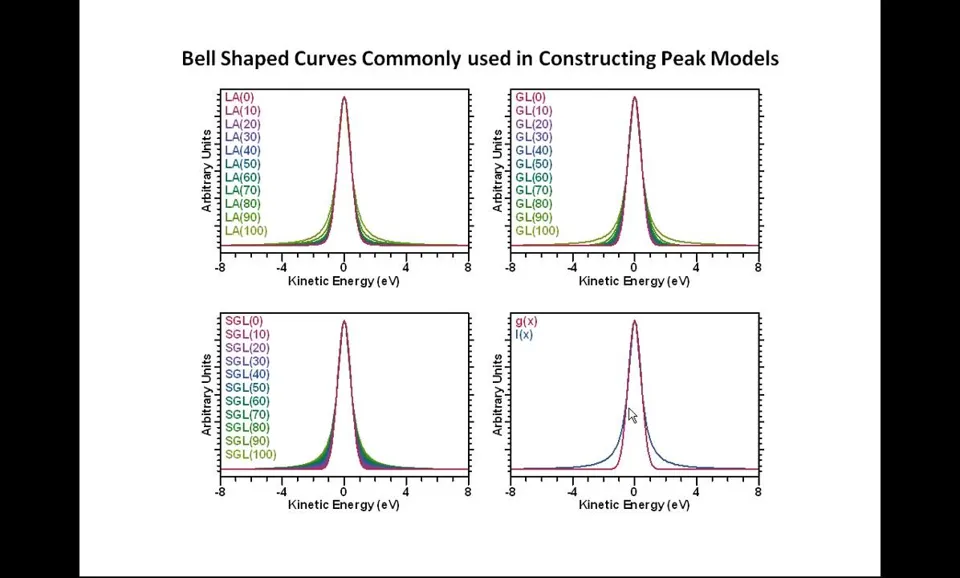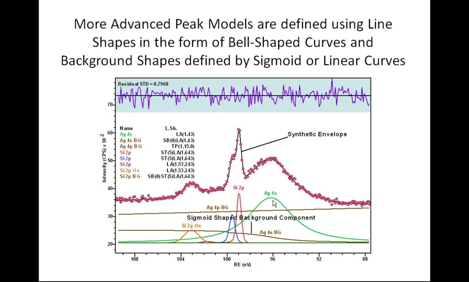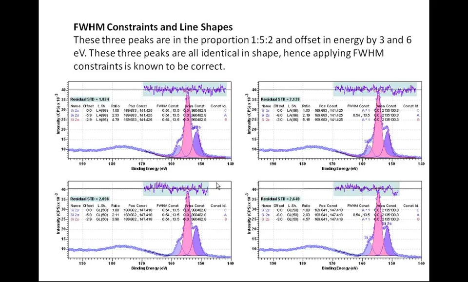 Peak models定义:XPS数据解释的关键组成部分; Line shapes要求:必须尽可能接近光电发射和测量过程产生的实际线形; 科学结果基础:使用准确线形对获得良好科学结果至关重要; 参数约束应用:当缺乏理想线形时需引入参数约束指导优化; 优化目标:确保获得物理意义明确且现实的结果。