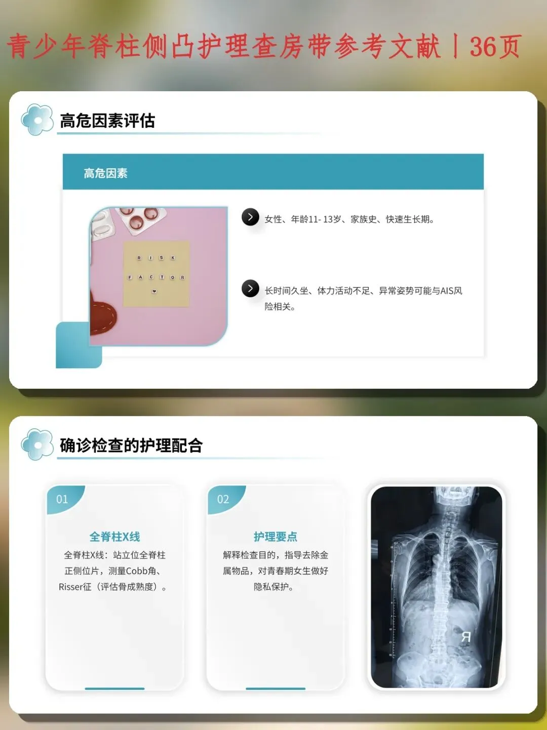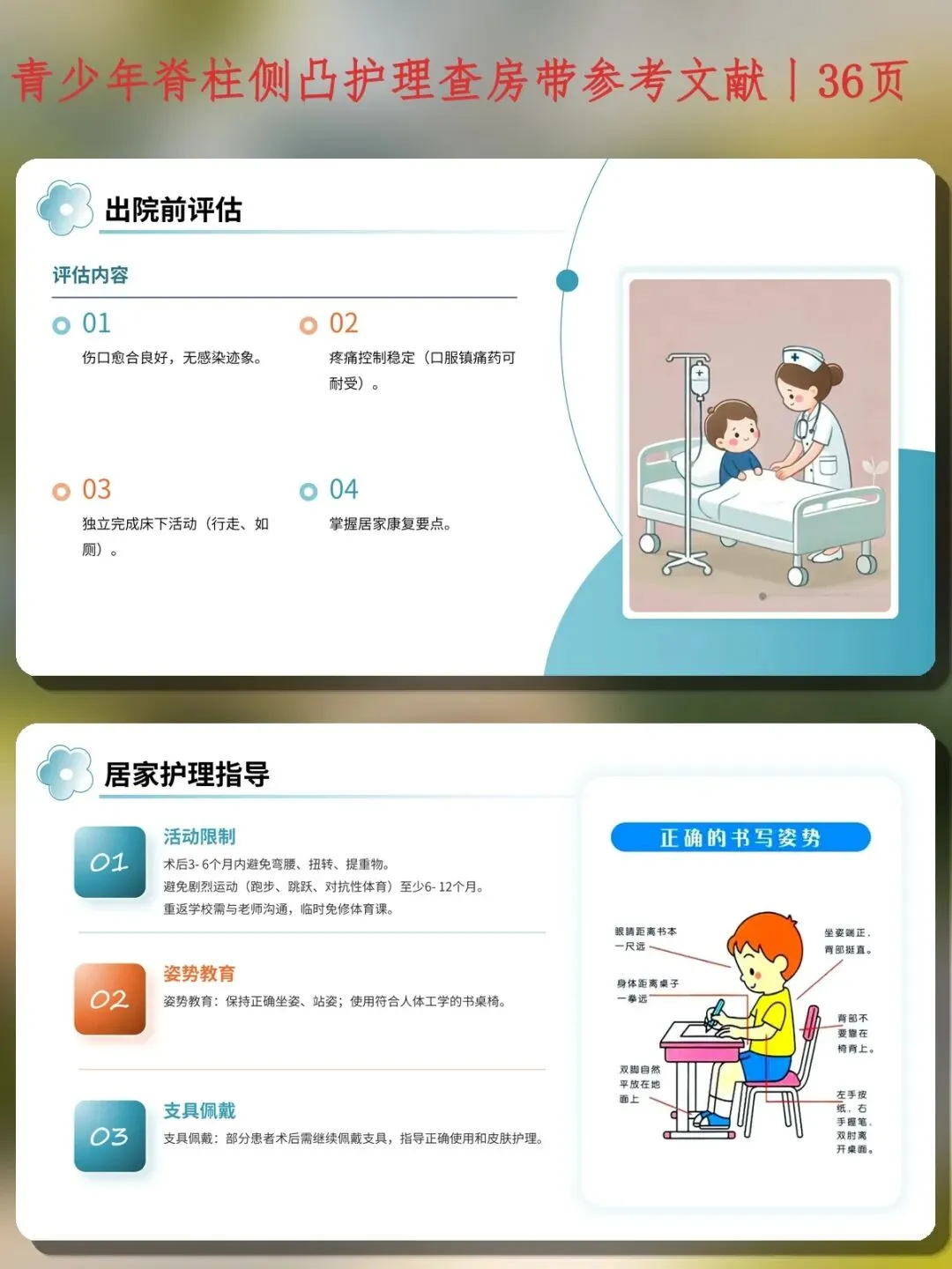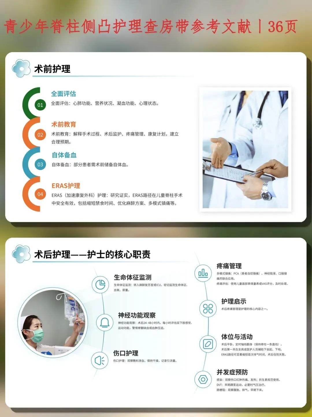 总结:青少年脊柱侧凸的护理贯穿筛查、保守治疗、围术期和康复全程。作为临床护士,要在护理查房中熟练掌握Adams前屈试验和ATR测量,做好支具依从性教育和皮肤护理,在围术期落实神经功能观察和ERAS护理路径,同时关注患儿的心理健康和生活质量。这也是优质护理的具体体现,值得在护士培训中持续强化。