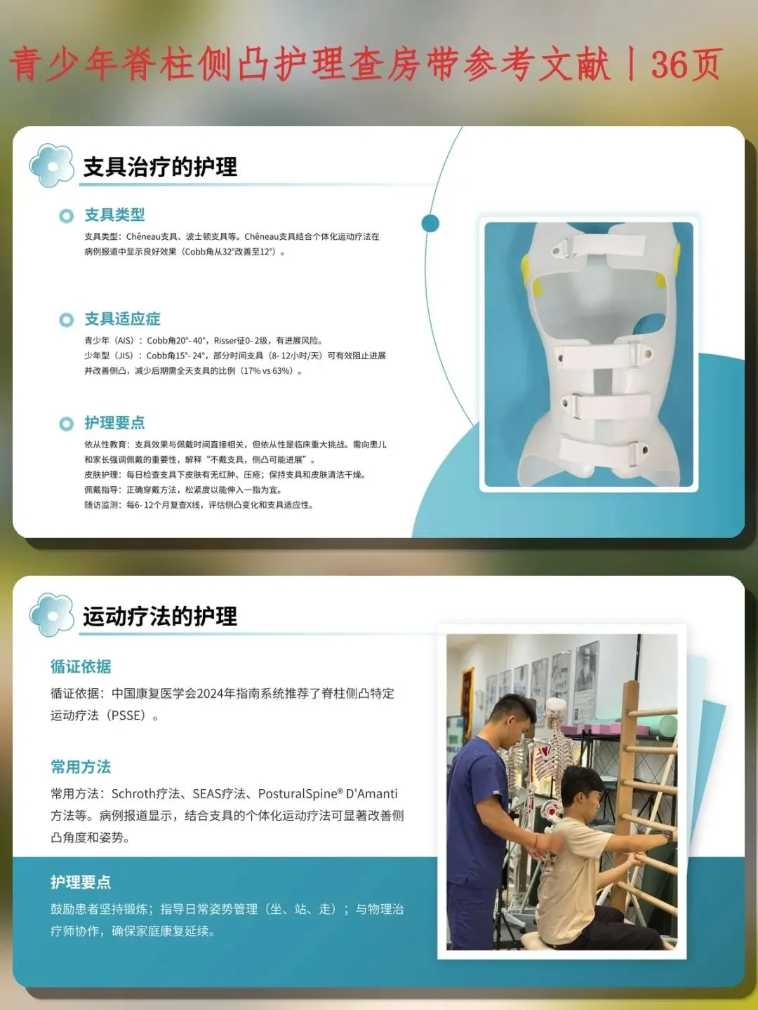 运动疗法:中国康复医学会2024年指南推荐脊柱侧凸特定运动疗法(PSSE),如Schroth疗法,支具联合运动优于单一治疗。