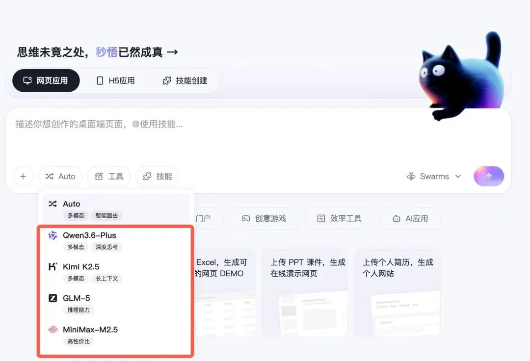 创造模块最核心的能力在于它的多模型支持和多模式切换。四大模型各有所长——Qwen3.6-Plus 在中文理解和复杂逻辑推理上表现突出,Kimi K2.5 擅长长文本处理和精细化代码生成,GLM-5 在多轮对话和上下文理解方面有优势,MiniMax-M2.5 则在创意生成和 UI 设计方面有独到之处。你可以根据项目需求灵活切换。