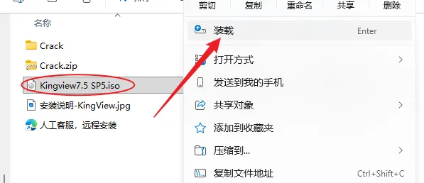 2.打开解压后的文,件夹找到并选【Kingview7.5 SP5.iso】文件,鼠标右键选择【装载】(如果没有【装载】选项的可以右键选择【打开方式—Windows资源管理器】打开,Win7系统点击鼠标右键解压)。