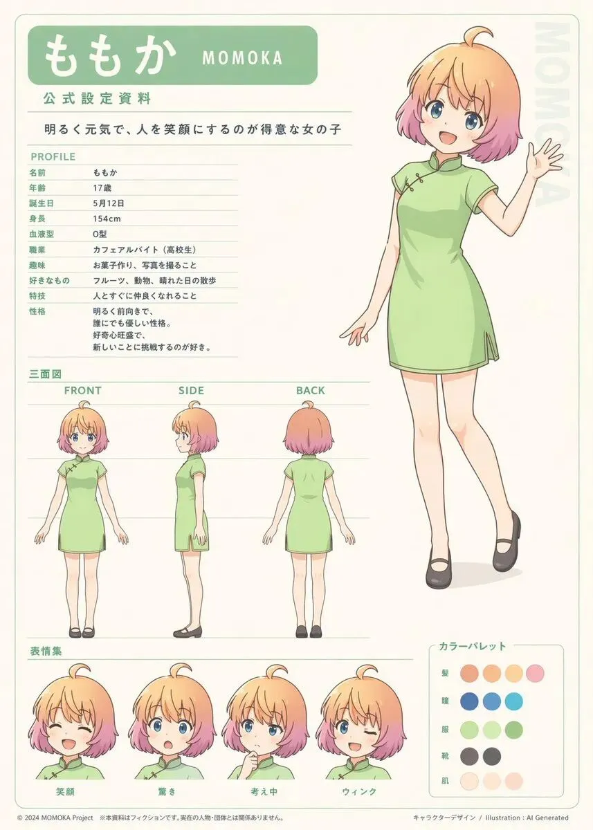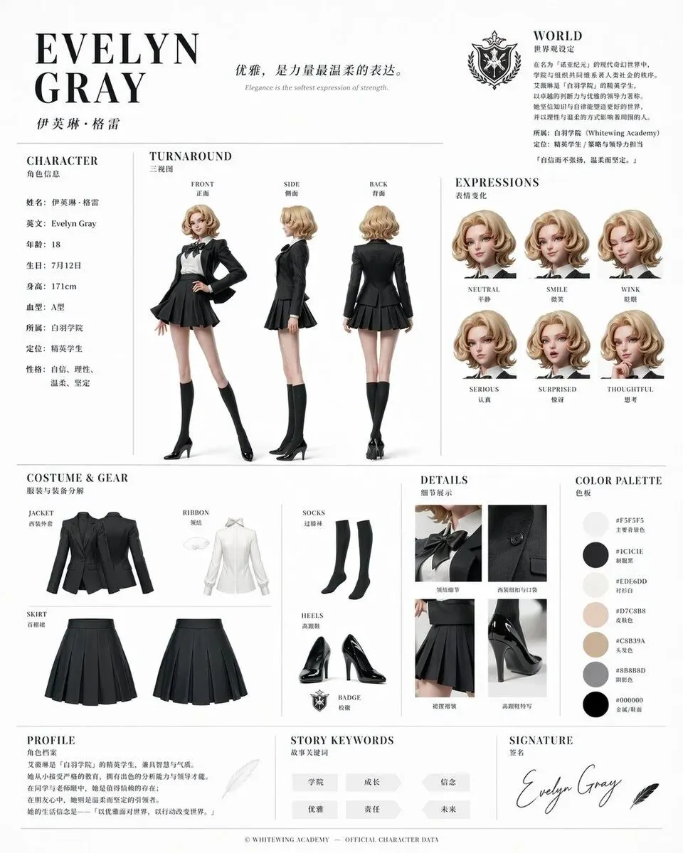 这个案例最值得看的不是“画风好不好”,而是「它把角色设计文档这件事直接做成了版式化输出」。对插画、游戏设定和 IP 前期开发来说,这类输出比单张立绘实用得多。
