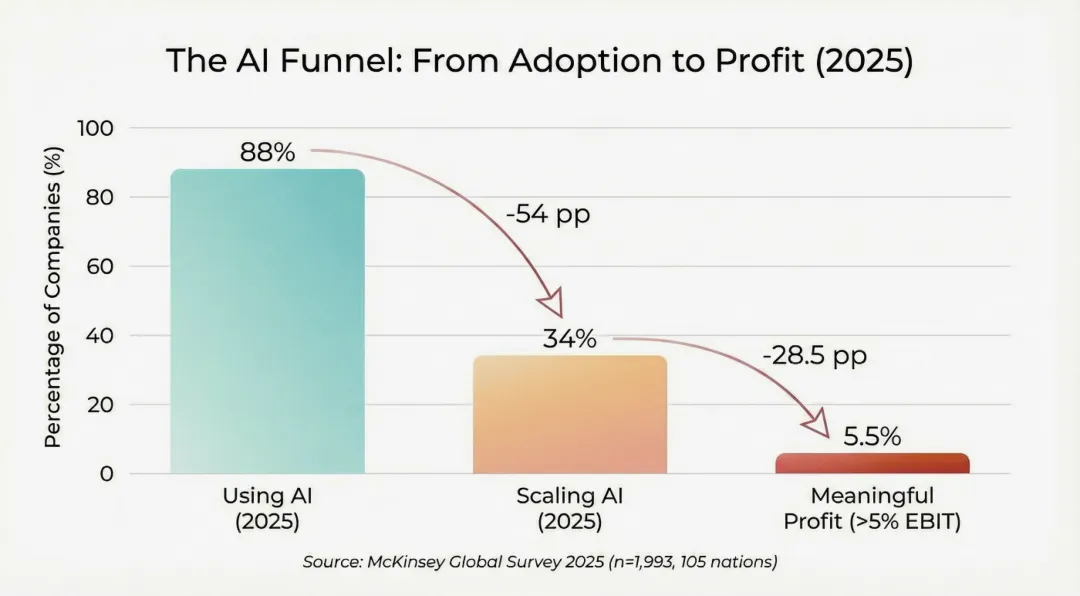 麦肯锡的数据同样打脸:虽然88%的企业声称在用AI,但只有可怜的6%从中获得了实质性的利润增长(EBIT贡献超5%)。