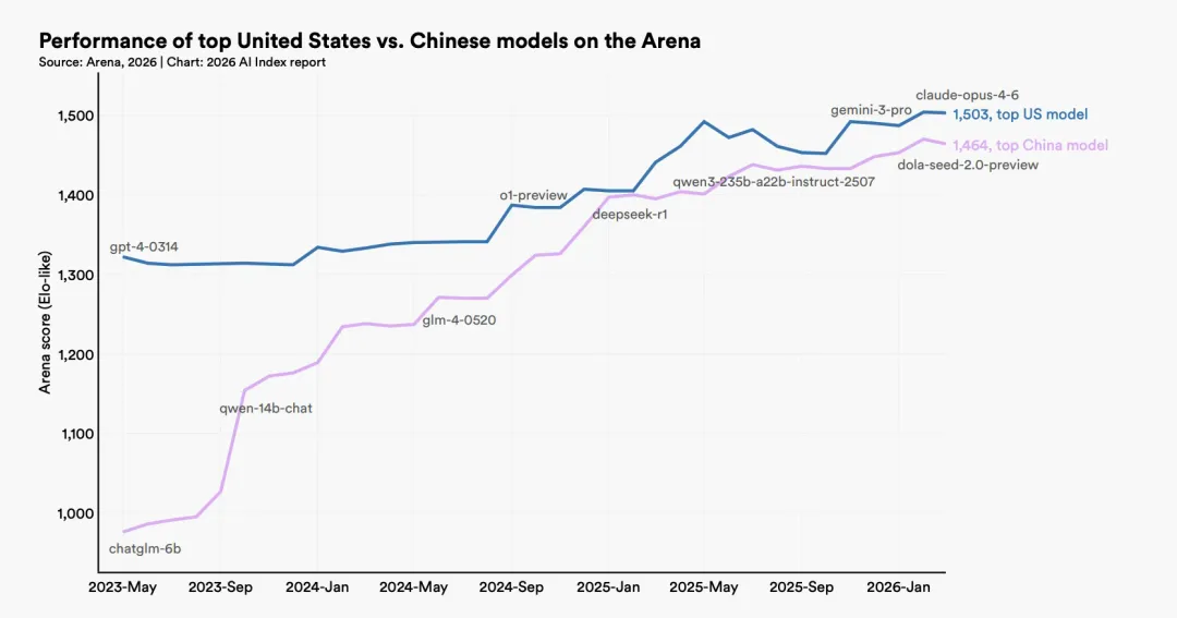 然而到了2026年3月,全球最权威的Chatbot Arena排行榜上,美国最强的Claude Opus 4.6与中国最强模型之间的差距,