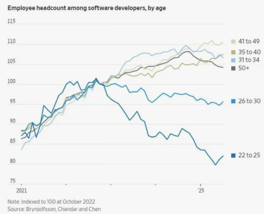 2025年,22-25岁的年轻软件开发人员就业率暴跌了近20%,而中高级程序员的岗位却保持稳定甚至增长。