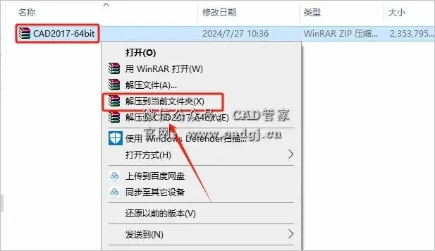 1.打开下载的CAD软件安装包,鼠标右击压缩包选择【解压到当前文件夹】。