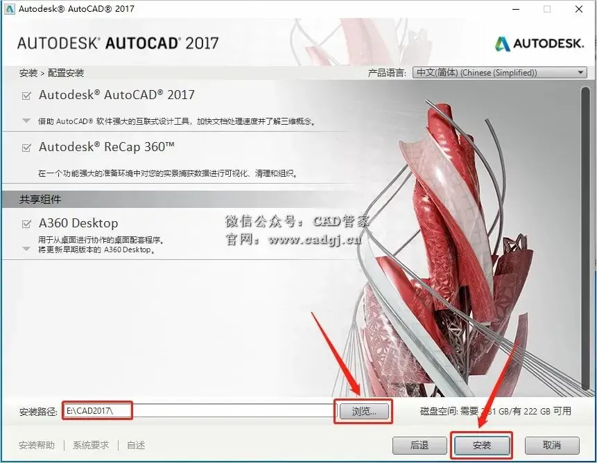 8.点击【浏览】设置CAD软件安装路径,建议安装到除C盘以外的磁盘,可自行设置,设置好安装路径后点击【安装】。