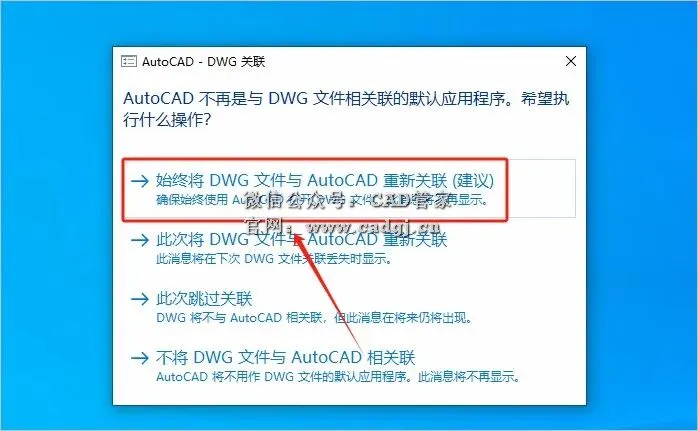 13.若出现如下图所示的界面,选择第一个【始终将DWG文件与 AutoCAD重新关联】,没有则忽略进行下一步。