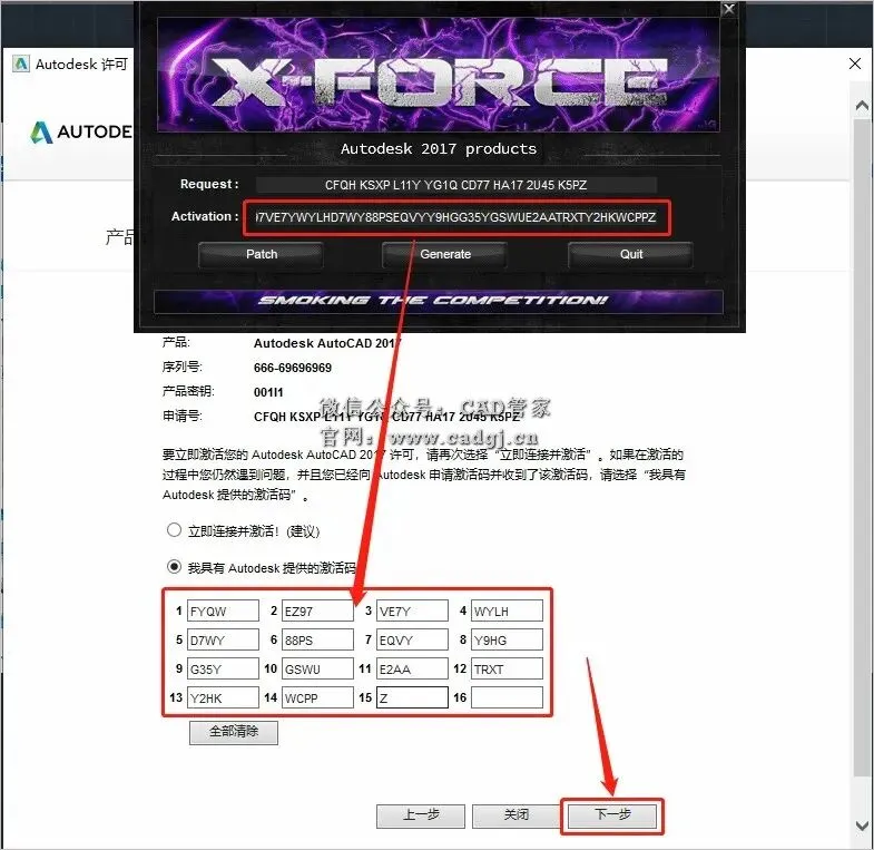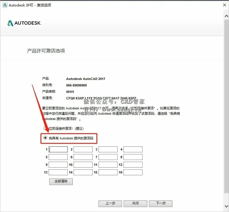29.全部选中Activeation中生成的激活码(仔细检查是否复制完整),使用快捷键Ctrl+C或者鼠标右击复制生成的激活码,然后使用快捷键Ctrl+V键粘贴激活码至我具有Autodesk提供的激活码方框中,最后点击【下一步】。