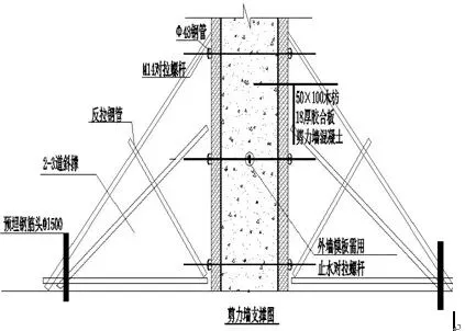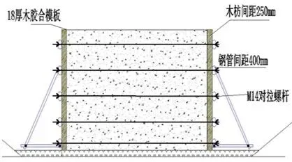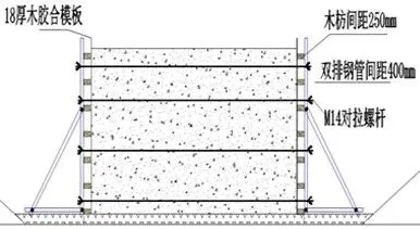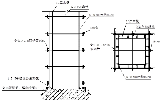 采用18mm厚胶合板,次龙骨采用50×100木枋间距250mm,主龙骨采用Φ48×3.0双钢管,间距450mm,配以M12对拉螺杆(外墙需用止水对拉螺杆)进行加固,水平方向间距500mm,竖直方向450mm