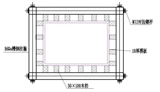 柱模板采用18厚双面覆膜多层板,次龙骨采用50x100木枋,角部次龙骨采用50x100木枋,柱箍采用对拉螺杆加16#a槽钢