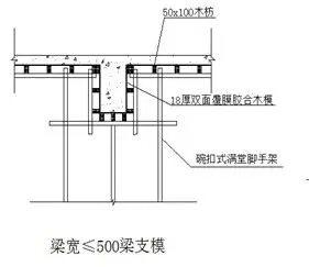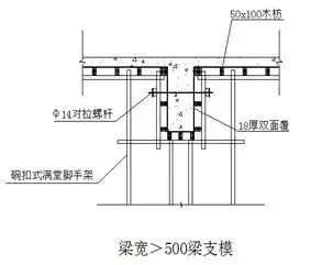 普通梁模板采用18厚胶合板,次龙骨采用50×100木枋,间距250主龙骨采用Φ48×3.0双钢管,间距500,配以M12对拉螺杆加固,间距500×500。