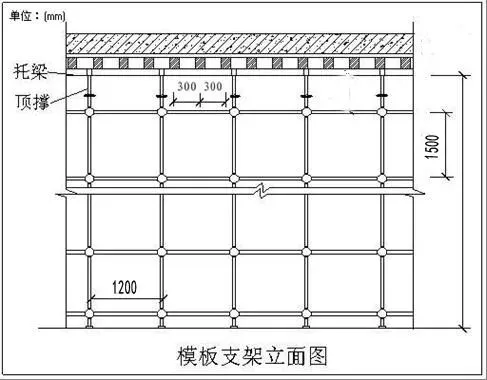板下立柱的间距为1200,架体的步距为1500,次楞采用50×100木枋间距300,主龙骨采用钢管,最大间距1200