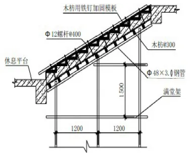 封闭式模板,下部留设出气口和振捣孔,出气孔直径100mm间距500mm,出气口内侧加铺200mm×200mm钢丝网,钢丝网边用20mm宽木条固定。立杆间距为1000mm×1000mm底部设置双向扫地杆,端部加设通长木枋垫板