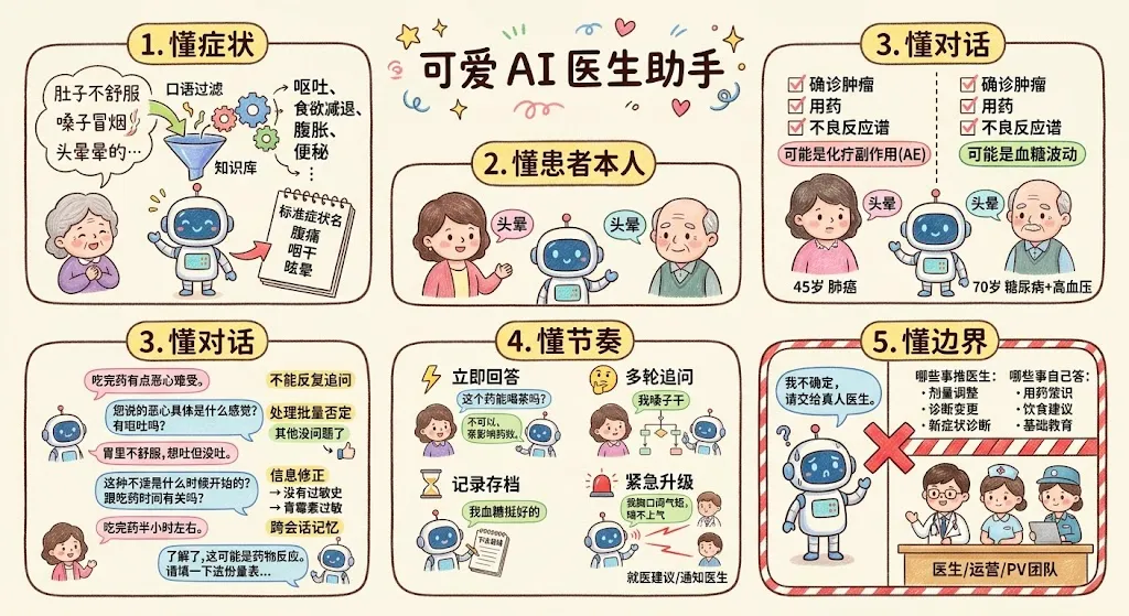 很多人听到"AI 患者管理",第一反应是"一个会聊天的机器人"。这个理解只对了 10%。真正有用的 AI 助手,必须同时做到下面五件事——