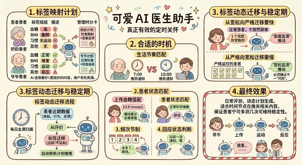 AI 需要做的是——每天一次全量扫描所有患者,根据他们近期的指标、行为、反馈,重新评估标签是否需要迁移。迁移一旦发生,下一轮推送就自动按新计划来。这套机制让运营不需要手动"调档",系统自己会随患者状态流动而调整。
