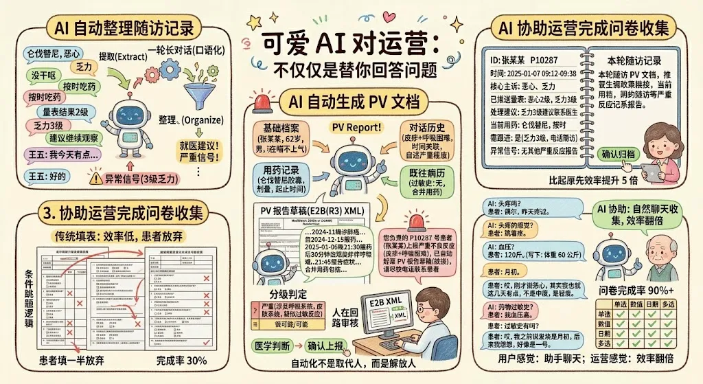 老王的上午第一件事,变成了认真审一份 PV 报告草稿——这件事过去他要 2 小时,今天他有 30 分钟就能做完。剩下的时间,他可以去给两位高风险患者亲自打个电话——这是 AI 永远做不到、但恰恰是最体现运营价值的事。