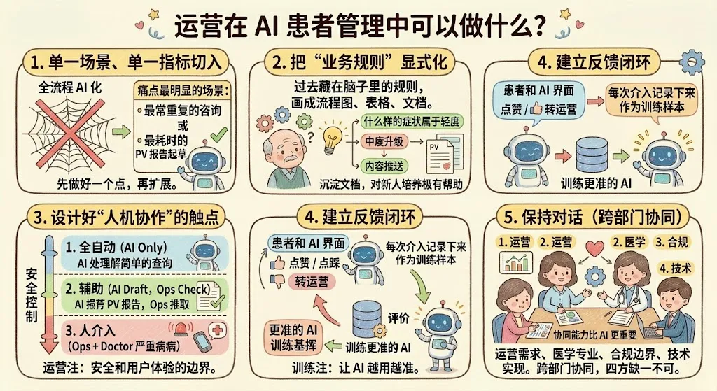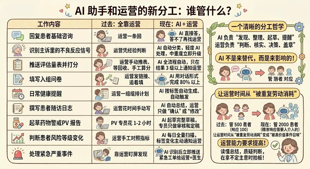 这里特别要强调一点:AI 不是来替代运营的,而是来放大运营的影响力的。过去一个运营能 "管" 500 个患者(实际能及时响应的可能只有 100 个),现在有了 AI 分担基础工作,同一个运营可以 "看到" 2000 个患者里所有真正需要人介入的那些。你的时间从"被重复劳动消耗"变成"被高价值事件召唤"。这对运营个人能力的要求不是降低,反而是提高了——你要能读懂 AI 的总结、质疑它的判断、在它拿不定主意时拍板。