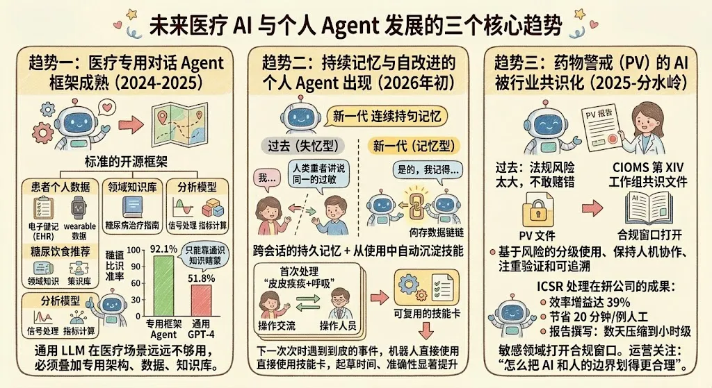 这对患者管理的意义在哪里?想象一下——过去的 AI 客服每次对话都是"失忆"的,你今天告诉它你对青霉素过敏,明天还得再说一遍。新一代 agent 可以持久记住每个患者的长期画像、对话偏好、历史问题,而且会从自己的每次处理中总结经验,把反复出现的工作流程沉淀成可复用的"技能"。