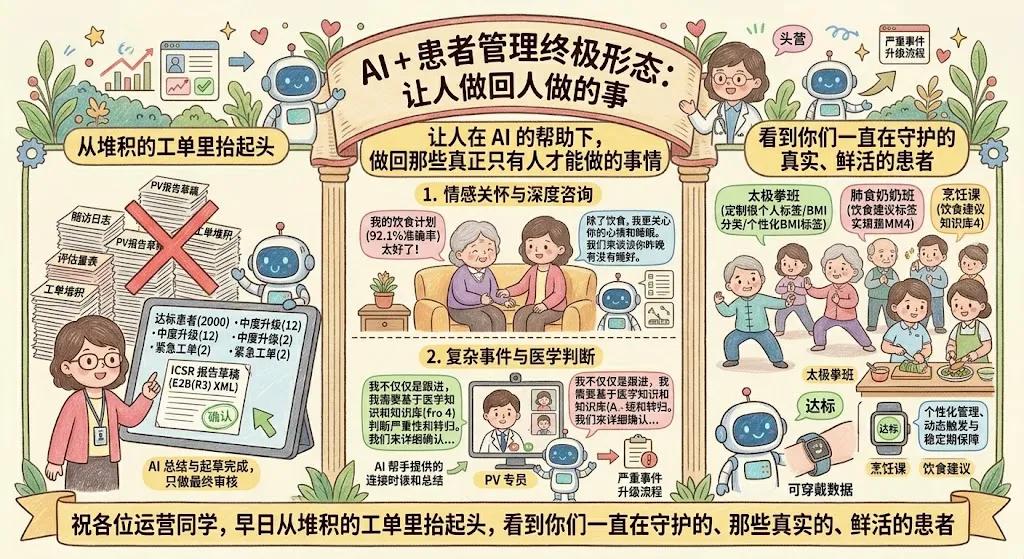 这才是"AI + 患者管理"最终要抵达的样子——不是让 AI 变得更像人,而是让人在 AI 的帮助下,做回那些真正只有人才能做的事情。
