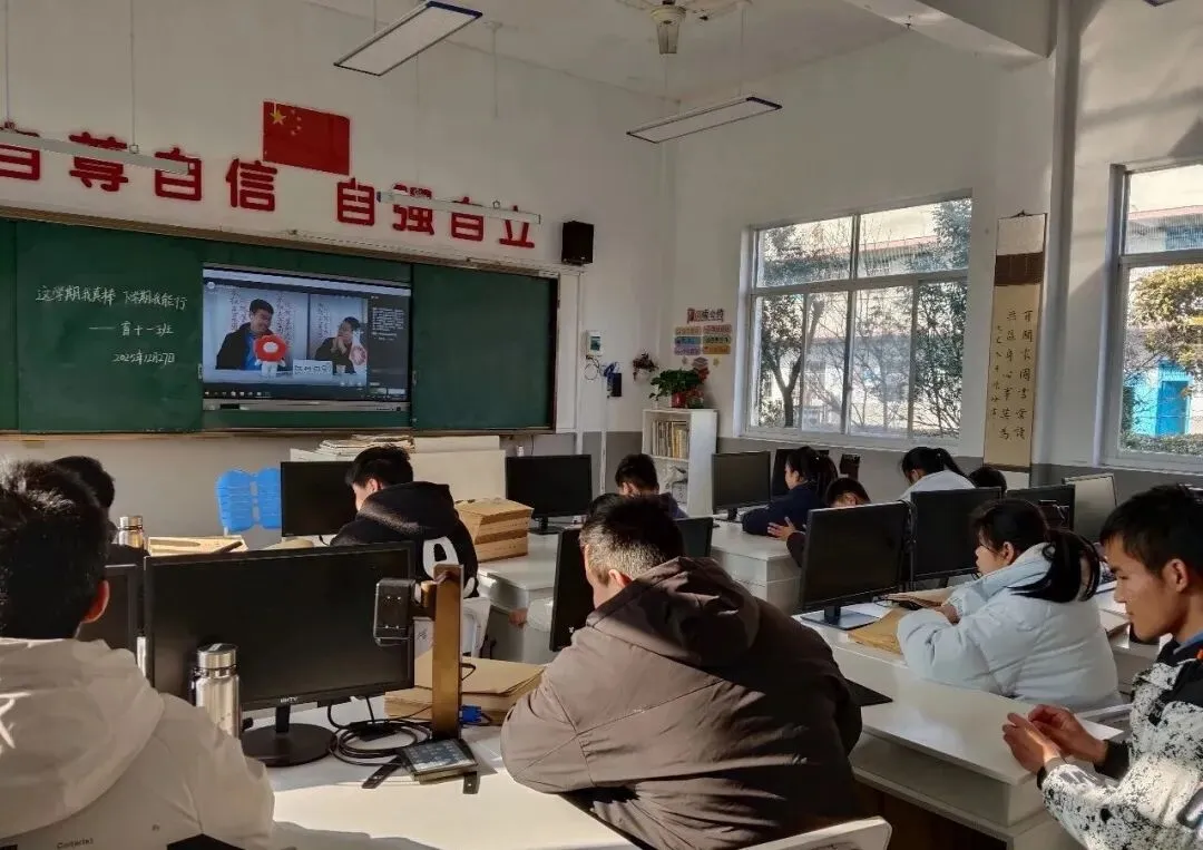 图为学生们在教室看直播课的画面
