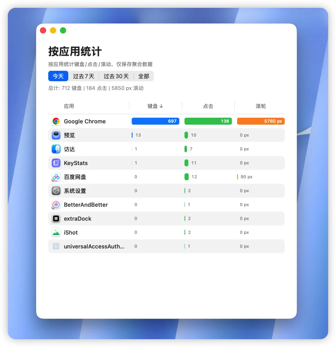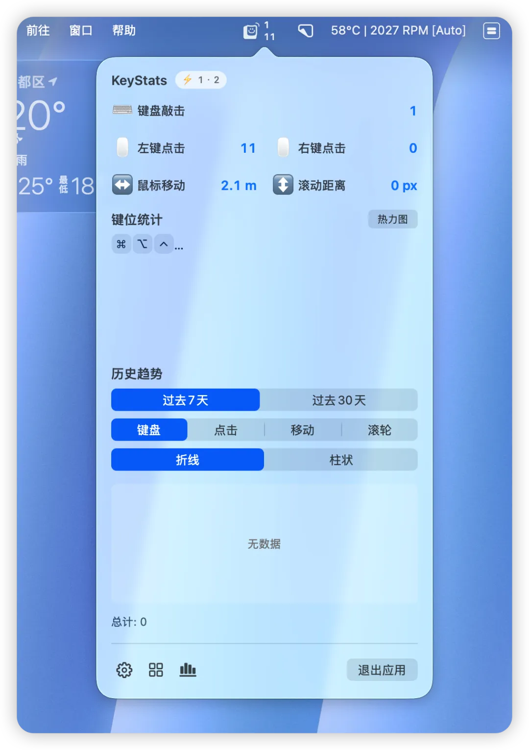 一款很有趣的软件,可以记录你鼠标移动距离,点击次数和键盘的敲击次数的软件,这款软件叫KeyStats,Github上面的一款免费开源软件,无广无内购。
