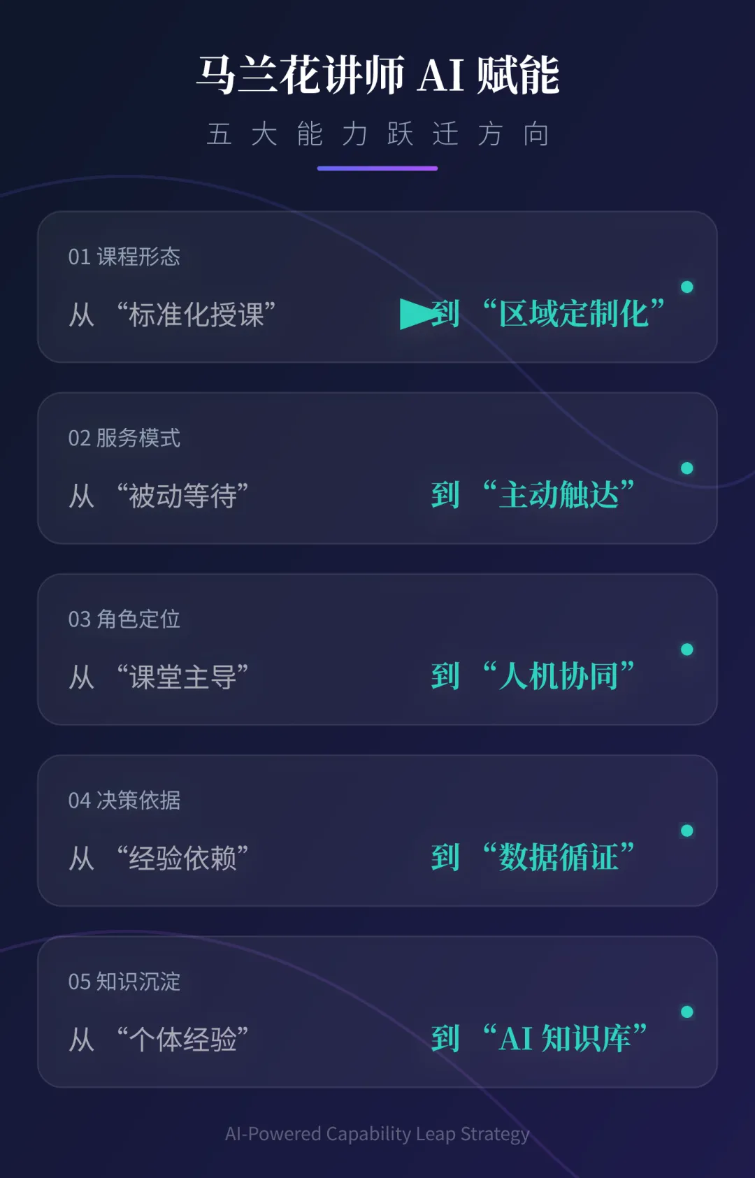 从 “标准化授课” 到 “区域定制化”比如以技能+创业为例,可以用 AI 快速提炼本地特色产业、聚焦重点群体需求,打造专属课程,实现 “一地一项目、一域一品牌”。AI 可以帮忙整理地方案例、解读政策,讲师专心打磨教学设计与内容质感。 从 “被动等待” 到 “主动触达”变身创业知识传播者,用短视频、直播分享实用干货,AI 辅助打磨脚本、优化表达,从守在课堂里的老师,变成走到学员身边的教练。 从 “课堂主导” 到 “人机协同”搭建 “AI 助教 + 真人讲师” 双师模式,把基础答疑、名词解释、术语科普交给 AI,讲师专注聚焦商业模式创新、风险研判等高阶教学,把精力用在更有价值的地方。 从 “经验依赖” 到 “数据循证”借助 AI 完成需求调研、识别学员能力短板、绘制学员画像、开发课程框架等,实现分层教学、精准指导,让每一次培训都更贴合需求、更有针对性。 从 “个体经验” 到 “AI知识库”把日常的教学经验和创业指导案例等梳理成结构化资源,借助AI形成知识库,让宝贵经验结构化呈现与沉淀、云端随时调用,提升备课与教学的效率。