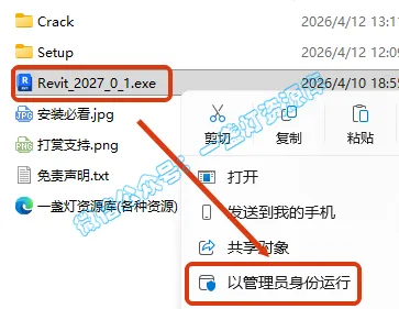 8.返回之前解压的文件夹,鼠标右键点击【Revit_2027_0_1.exe】选择【以管理员身份运行】