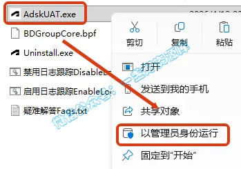 12.返回之前解压的文件夹,依次打开【Crack——AdskUAT】文件夹,选中【AdskUAT.exe】文件,,鼠标右键选择【以管理员身份运行】