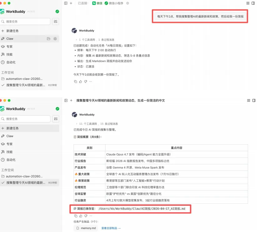 2、自动执行任务,设置好任务时间和内容,workbuddy 会自动执行处理任务
