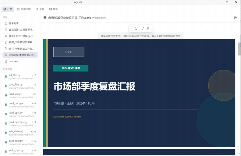 适用场景:已有文本素材、汇报大纲或参考模板,需要快速生成演示文稿。