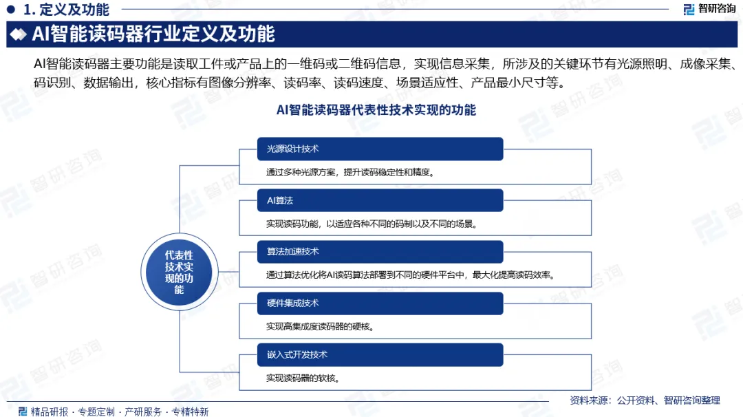 行业定义及功能:AI智能读码器主要功能是读取工件或产品上的一维码或二维码信息,实现信息采集,所涉及的关键环节有光源照明、成像采集、码识别、数据输出,核心指标有图像分辨率、读码率、读码速度、场景适应性、产品最小尺寸等。