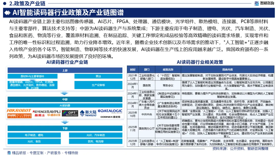 产业链核心节点:AI读码器行业产业链上游主要包括图像传感器、AI芯片、FPGA、处理器、通信模块、光学组件、散热模组、连接器、PCB等原材料与主要零部件,算法技术支持等;行业中游为AI读码器生产与系统集成;行业下游主要应用于电子制造、锂电、光伏、汽车制造、光伏、食品和医药、物流等行业,覆盖原材料追溯、在制品追踪、关键工序绑定和成品校验等高效精确的读码需求场景。