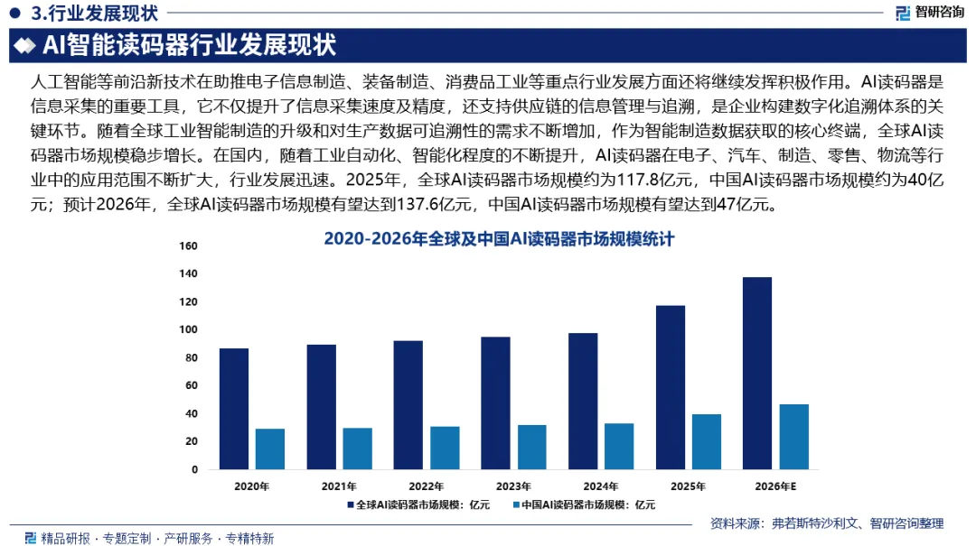 全球市场规模:随着全球工业智能制造的升级和对生产数据可追溯性的需求不断增加,作为智能制造数据获取的核心终端,全球AI读码器市场规模稳步增长,据统计,2025年,全球AI读码器市场规模约为117.8亿元,预计2026年有望达到137.6亿元。
