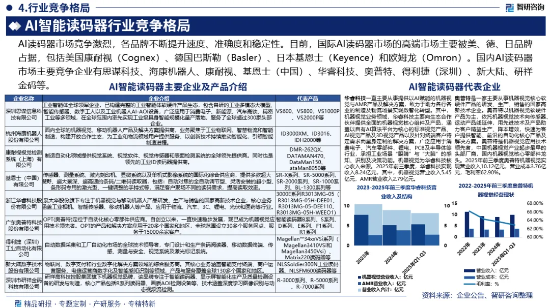 竞争情况:AI读码器市场竞争激烈,各品牌不断提升速度、准确度和稳定性。目前,国际AI读码器市场的高端市场主要被美、德、日品牌占据,包括美国康耐视(Cognex)、德国巴斯勒(Basler)、日本基恩士(Keyence)和欧姆龙(Omron)。国内AI读码器市场主要竞争企业有思谋科技、海康机器人、康耐视、基恩士(中国)、华睿科技、奥普特、得利捷(深圳)、新大陆、研祥金码等。