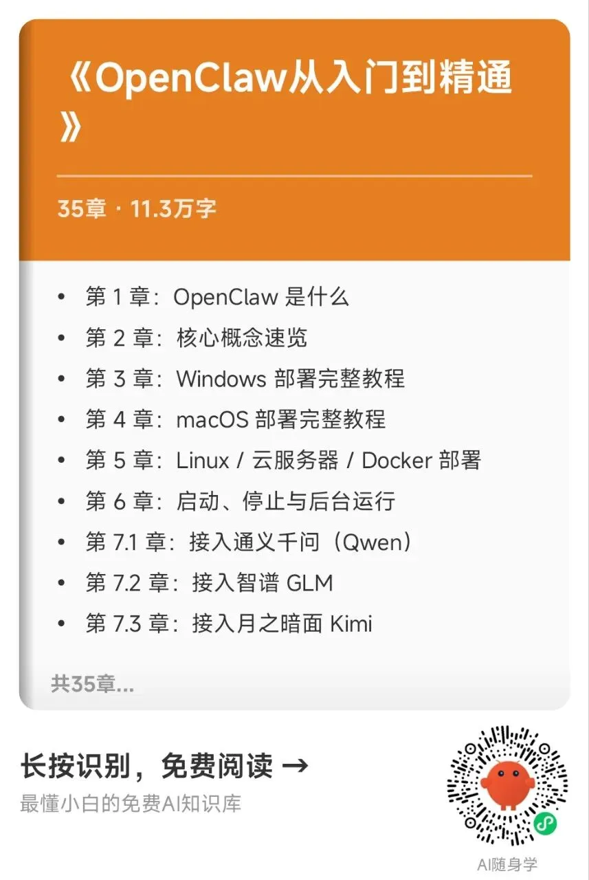 不会选模型,OpenClaw白玩!这一步错了,后面全白费昨天下血本用Claude模型,撰写了一份《OpenClaw从入门到精通》的手册,总字数10万+下面是新的内容大纲。内容我整体走查了一遍,不能说100%对,但也大差不差了!大模型就是OpenClaw的大脑,大脑不给力,四肢再发达都没用!内容我已经更新到了飞书知识库,之前拿的链接的小伙伴打开就能看到最新的,还没有领取的可以🔍wuzhuv2!
