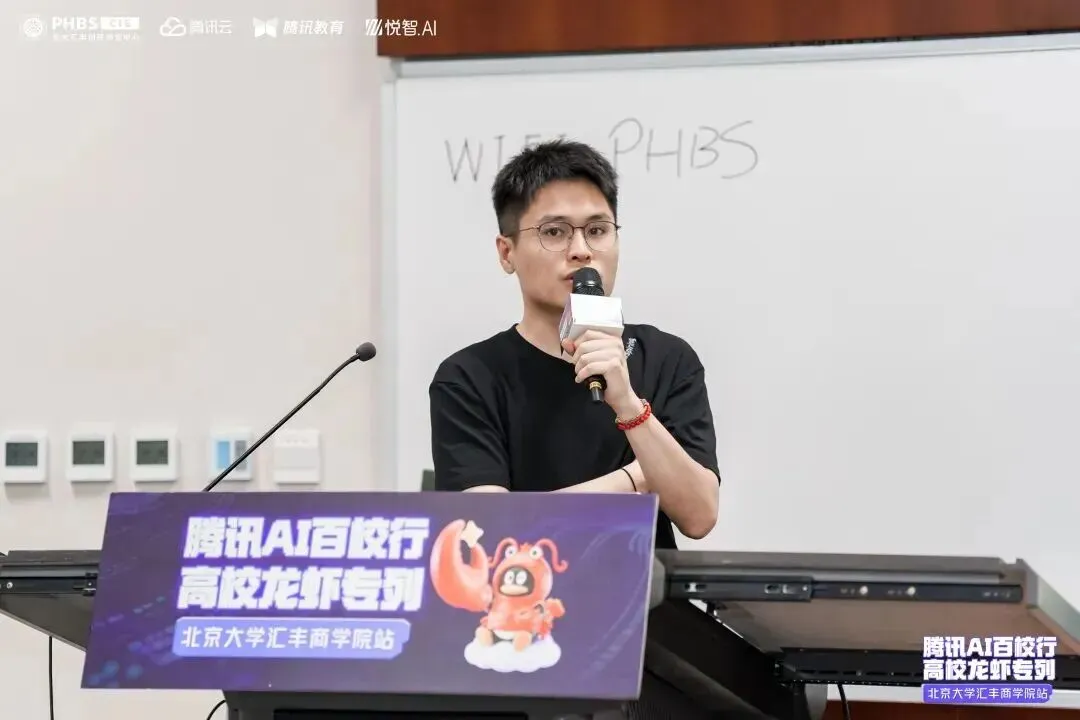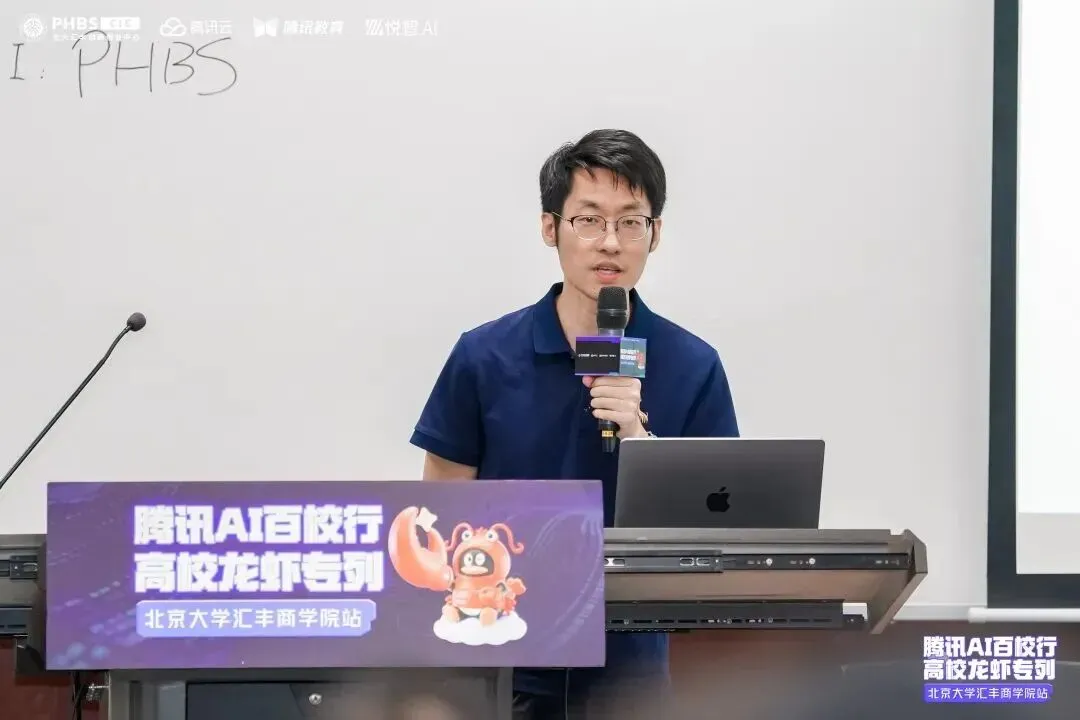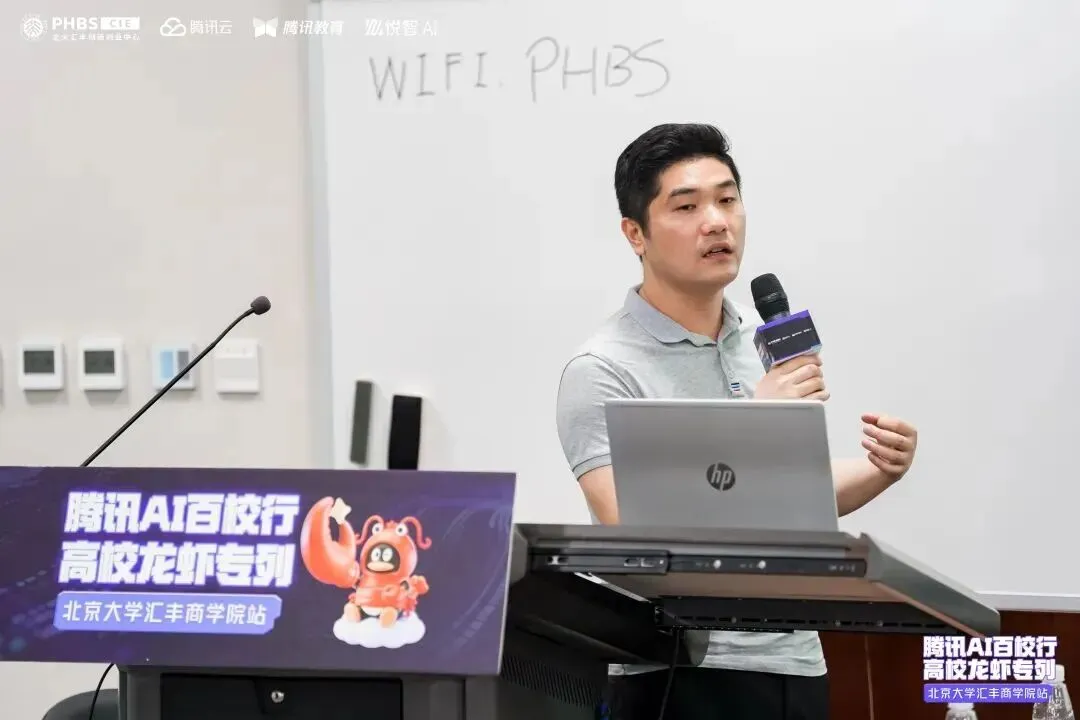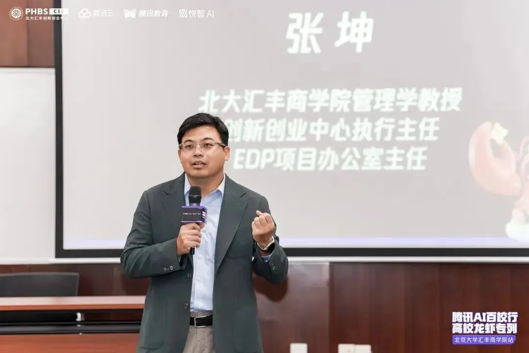 下午的装机活动由北京大学汇丰商学院创新创业中心联合腾讯教育主办,张坤教授为本次活动致辞。他结合商学院创新人才培养目标,以及数字化时代商科人才的核心能力需求,阐释了AI智能体工具对提升职场工作效率、落地学术科研创新的重要价值。