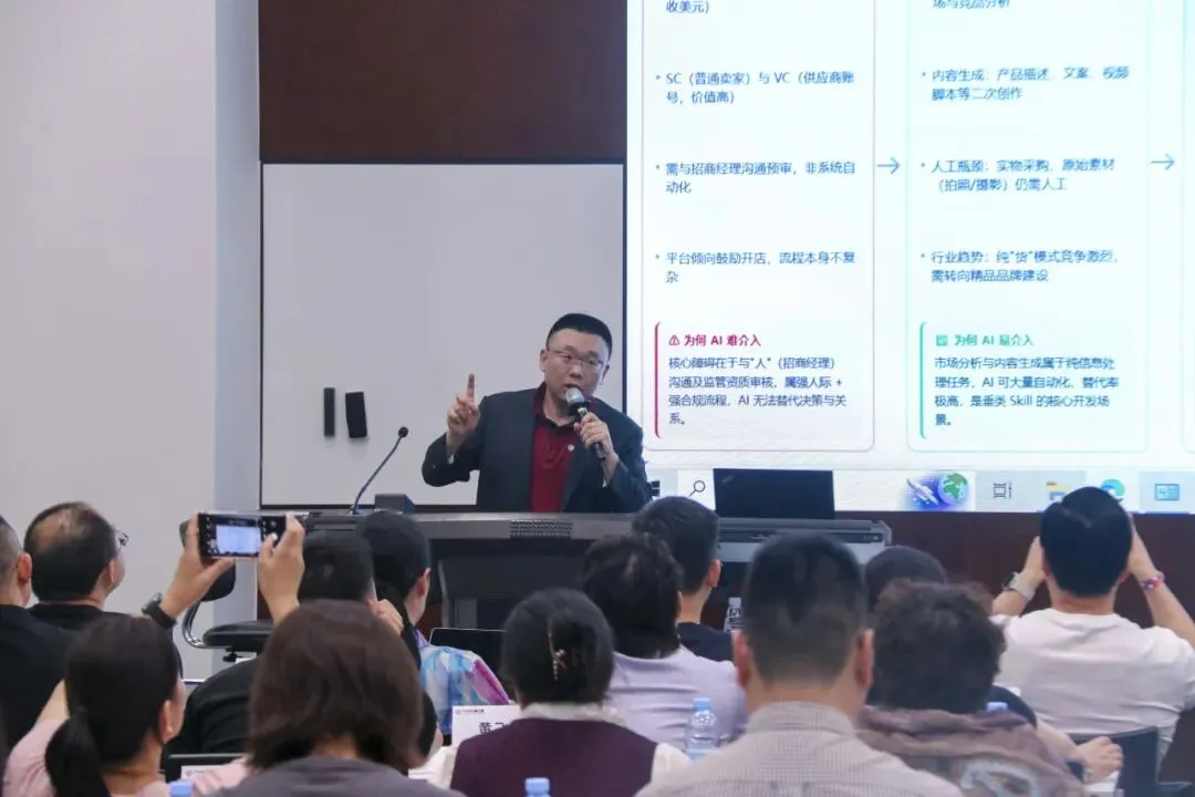 腾讯装机实操结束后,学员重返课堂,迎来下午场压轴分享——北大汇丰汤一诺老师带来跨境电商实战专题。现场以虚拟企业的宠物陪伴机器人项目为例,演示了AI智能体极速落地能力——5 分钟虚拟产品、30 分钟生成多语言小程序,半分钟即可产出电商产品文案并完成数据追踪与价格对比;同时拆解了AI智能体用工成本与合规风险,明确了AI智能体在信息处理类场景的高效适用、人际沟通与合规类工作的能力边界仍然需要人工进行主导