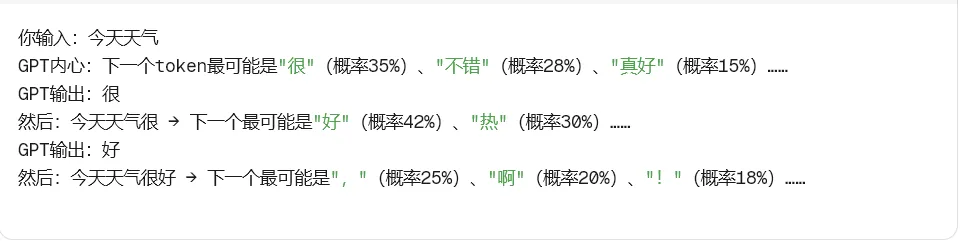 你玩过成语接龙吗?"一心一意"→"意气风发"→"发愤图强"……GPT干的事差不多,只不过它接的是下一个token(词片段)。