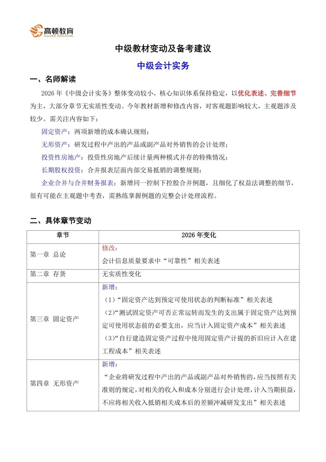 -1- 2026年中级会计教材3科变动解读 有增有减有改,速看! 终于等到啦!2026年中级教材来了,今年变化巨大,高顿教育专业老师紧急整理了中级三科教材变动解读,一起来看看! 一、《中级会计实务》整体变动分析