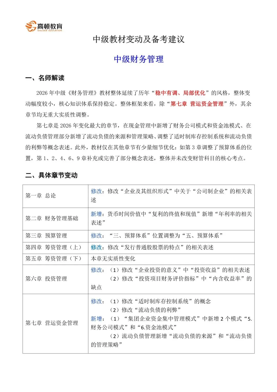 第七章是2026年变化最大的章节,在现金管理中新增了财务公司模式和资金池模式、在流动负债管理部分新增了流动负债的来源和管理策略、调整了适时制库存控制系统和流动负债的利弊等概念表述。此外,教材仅在其他章节有少量细节优化:如第3章调整了预算体系的位置,第1、2、4、6、9章补充或完善了部分概念表述,整体并未改变财管科目的核心考点。