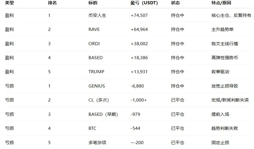 从交易记录来看拉哪并不对市场行情进行预测,只做跟随,也就是趋势行情,专注于捕捉已经启动的币种。涉及标的包括:币安人生、RAVE、ORDI、BASED、TRUMP、SIREN、1000SATS、1000RATS、EIGEN、PIXEL、EDGE、BAN、ASTER、AIA、FIGHT、GENIUS、CL、BTC、GIGGLE、HYPE、BLESS、PUMP、HEMI、CFX。