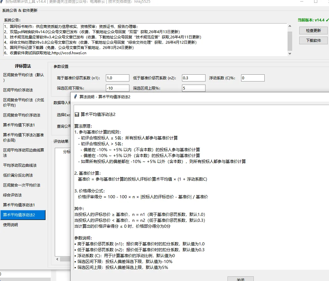 1、新增“算术平均值浮动法2”算法,之前的算术平均值浮动法改名1,因为总部和各省市公司招标文件同名的算法,计算规则不一定一样,所以计算前需要核对好算法说明