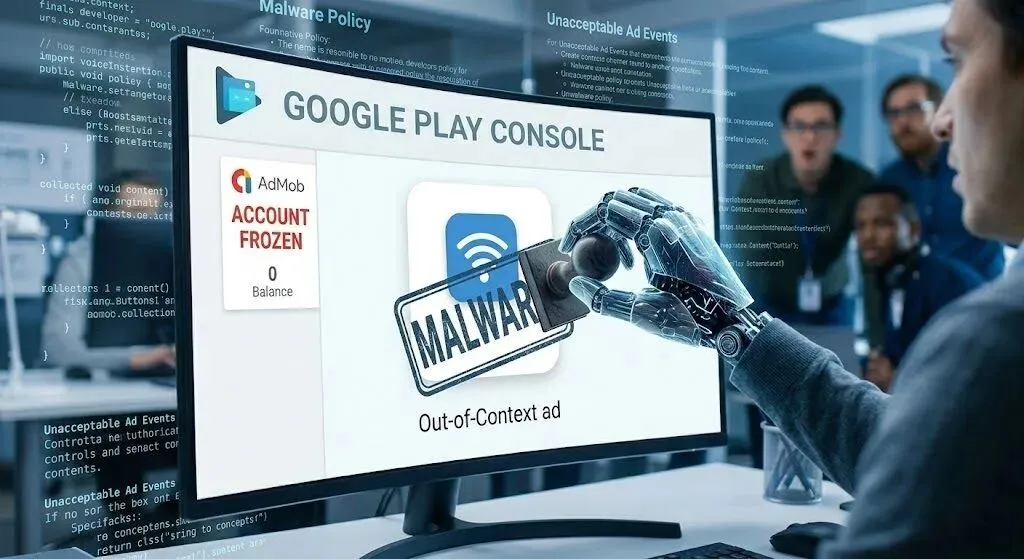 过度变现与外挂广告(OOC Ads),在 Google Play 的处罚库中被等同于最恶劣的恶意软件(Malware)。一旦触发,惩罚是极度毁灭性的:不仅应用下架,往往还会连带导致 AdMob 资金被冻结,辛辛苦苦赚来的美金直接化为乌有。