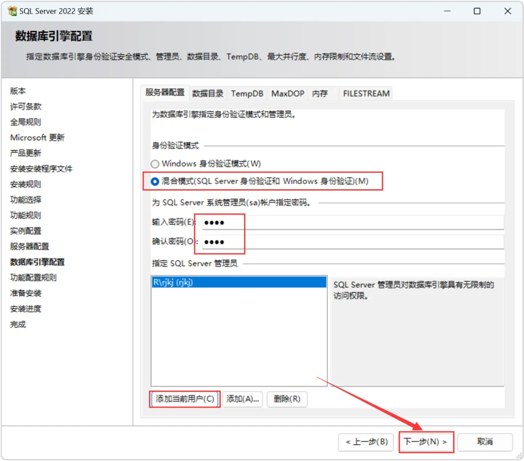 13.选择【混合模式……】,然后设置密码,点击【添加当前用户】,点击【下一步】。