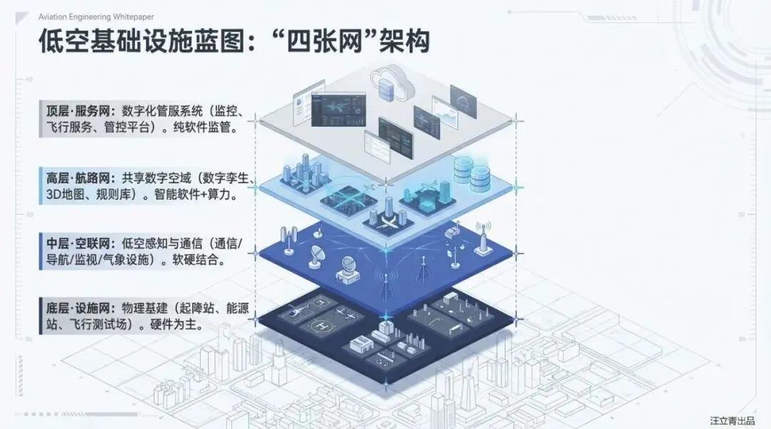 低空经济的破局点并不在飞行器制造,而在于搭建一条肉眼看不见的“天际线隐形公路” 。面对未来数十倍量级跃增的高频次、高密度飞行,传统的地面通信和监控技术已彻底无法支撑 。 这份研报拨开概念迷雾,直指低空经济的底层逻辑:必须依靠基础设施先行,重构底层蓝图 。 第一,打通低空底座的“四张网”架构。