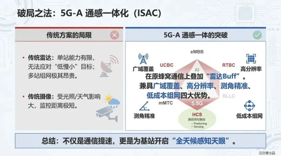 低空基建并非单纯盖停机坪,而是由设施网(物理硬件)、空联网(通信与感知融合)、航路网(共享数字孪生空域)和服务网(数字化管服系统)构成的立体管控矩阵 。只有软硬结合,才能让管理机构对所有飞行器“看得见、叫得到、管得住” 。 第二,两大核心科技攻克管控死角:5G-A与北斗网格。 要在极度复杂的城市建筑群中分辨并管控海量无人机,必须依靠两大杀手锏技术: 5G-A通感一体化(ISAC): 摒弃单站能力有限且昂贵的传统雷达,直接在现有蜂窝通信基站上叠加“雷达Buff” 。通过时域、频域或空域复用通信与感知信号,基站将开启全天候感知天眼 。