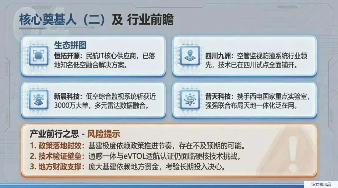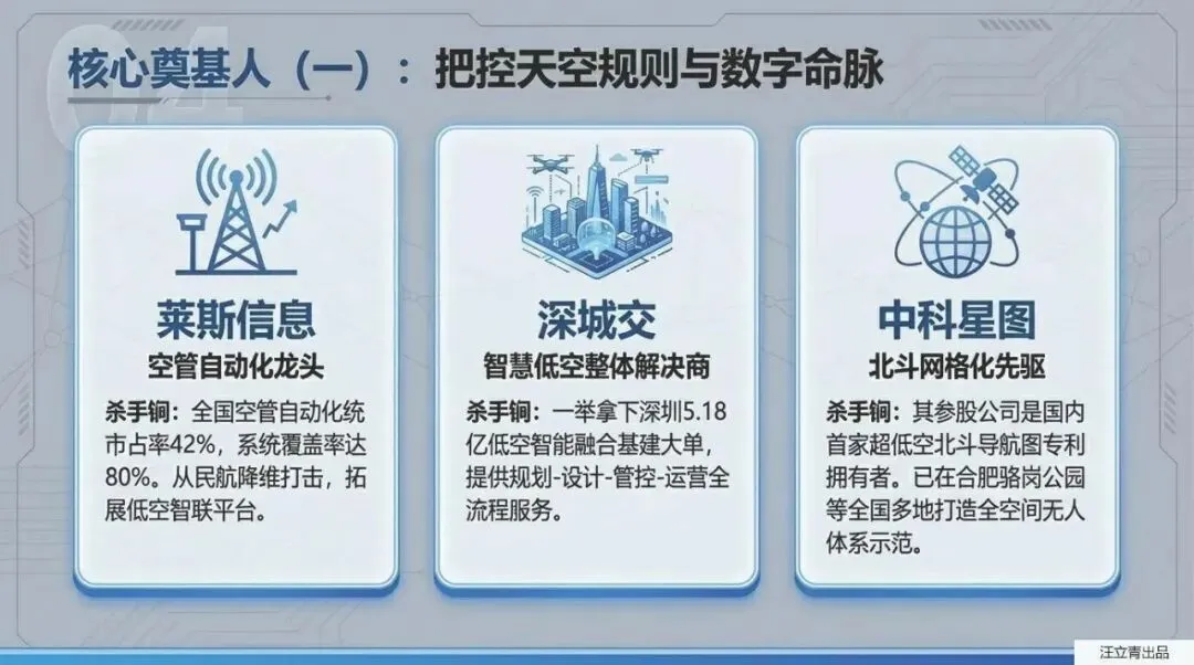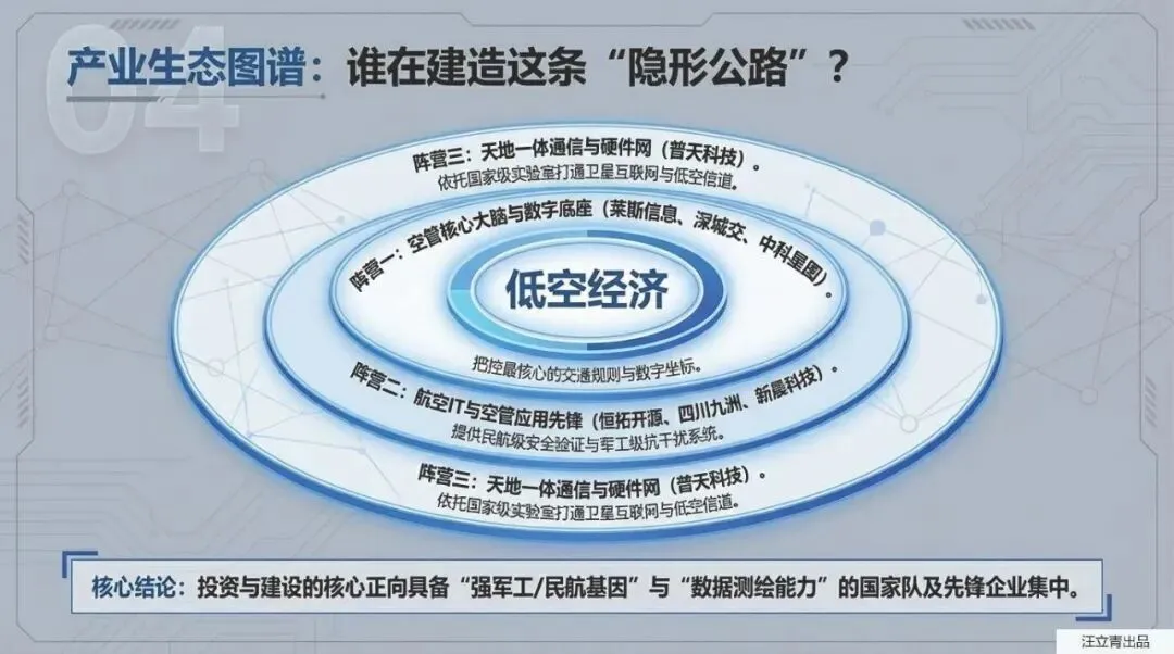 地方政府正以极高的量化指标和资金入局:安徽省剑指2025年冲刺160万飞行小时天量 ;深圳市不仅对基建给予百万级直接补贴,更率先抛出高达5.18亿元的低空智能融合基础设施超级标单 。 第四,产业图谱:谁在瓜分低空基建红利? 低空基建的投资核心,高度集中于具备“强军工/民航基因”与“数据测绘能力”的国家队及先锋企业 。