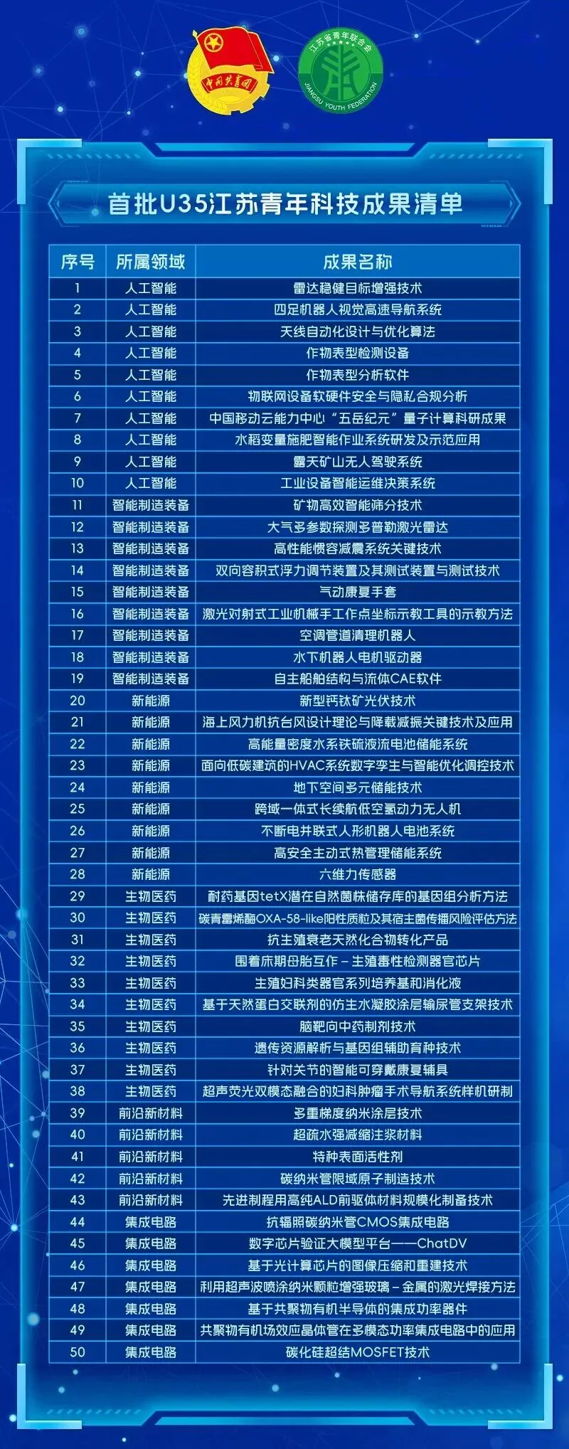 科创青年聚力,AI成果焕新。江苏科技人才“U35培育”行动,是省委人才办指导下,由团省委联合省科技厅、省工信厅、省科协、省产研院共同打造的青年科技人才品牌项目。“U35培育”聚焦35岁左右、手握核心技术转化成果的科创新锐,面向全省集成电路、前沿新材料、智能制造装备、新能源、人工智能、生物医药6大产业领域,优选青年科学家和科技型青年企业家。2025年优选首批184名培育对象,100%拥有自主知识产权,其中37%已创办科技企业,融资总额突破26亿元。